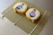 卵を巻いて、チーズにのりを巻いて、ご飯を盛って・・・・・直径12センチのかわいいおひなさまのお寿司が完成しました。
